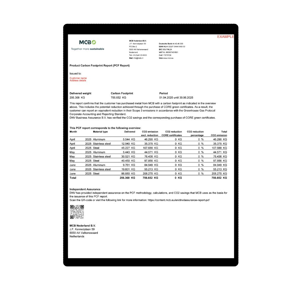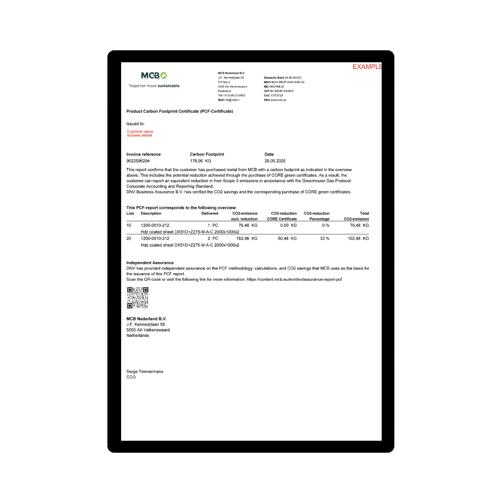 Ein CORE-Zertifikat ist ein offizieller und zertifizierter Nachweis dafür, dass Sie nachhaltig Metall bei MCB eingekauft haben, einschließlich einer nachweisbaren CO₂-Einsparung. Diese Reduktion wird gemäß dem Greenhouse Gas Protocol berechnet und von einer unabhängigen Stelle überprüft. Mit diesem Zertifikat können Sie die damit verbundene Scope-3-Emissionsreduktion in Ihre eigene Nachhaltigkeitsberichterstattung einbeziehen.